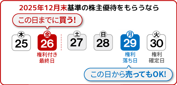 | 12月末基準の株主優待をもらうなら 12月26日(金)15時30分までに! |
